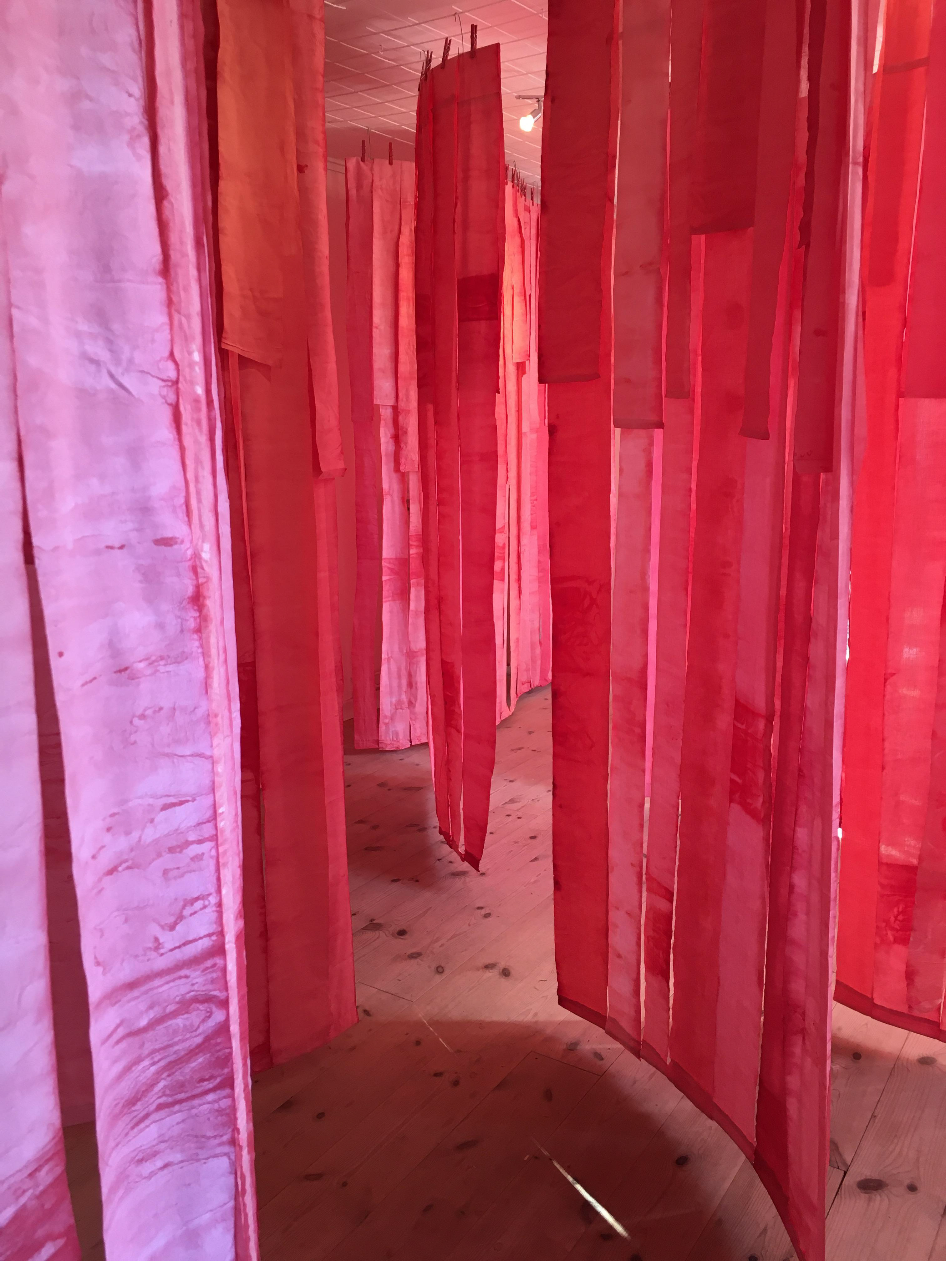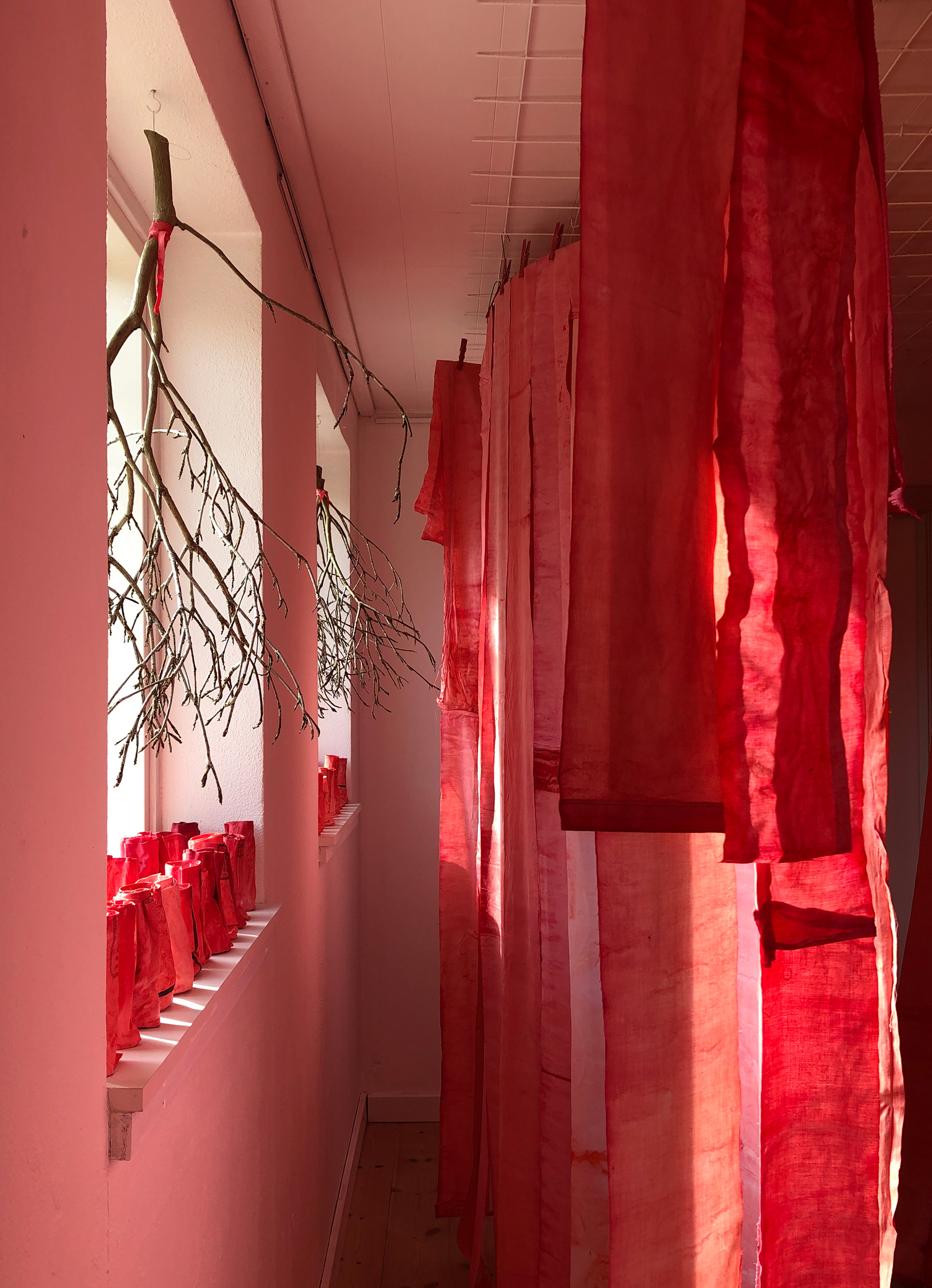 It’s been getting harder to breathe as we try to stand tall against an increasingly heavy, tense atmosphere around oxygen, self-determination and space. This installation germinated from a need to resist feelings of anxiety and restriction, and creates a space to breathe and reflect. The work is made with used bed sheets from Danish hospitals and care homes. Numerous caregivers have made and unmade beds with them countless times. The fabric holds stories and meaning. They carry the evidence of the hundreds of patients who have laid on these sheets, in pain and in relief, hoping and despairing, failing and healing, in fear and in acceptance, asleep and awake, breathing and, no longer breathing. Ren/Uren (Clean/Unclean) 2021 Used hospital sheets, dye, paint, starch, metal, wood, audio